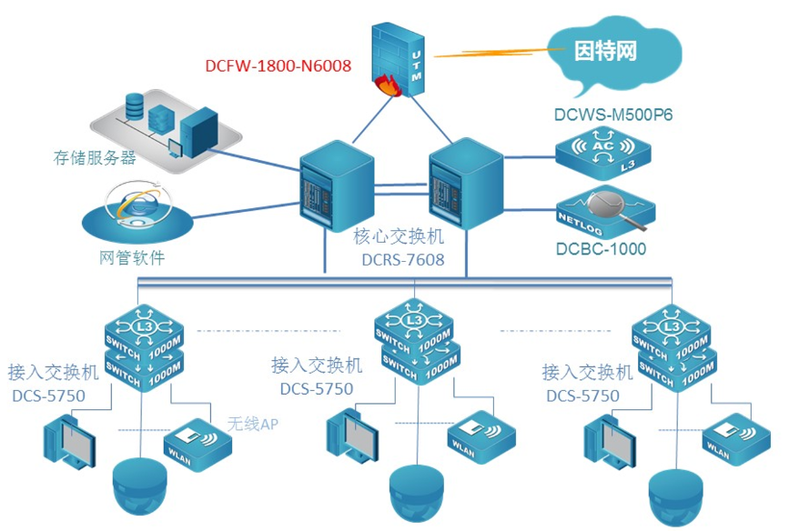 中国江苏白马农业会展中心数据网核心采用两台UG环球视讯新一代全分布式架构的核心路由交换机DCRS-7608E,顺利获得VSF功能实现核心冗余和负载分摊;该设备具备强大的业务自适应能力,支持网络平滑升级和策略灵活调度,实现业务快速部署,从而构建业务定义的网络。网络出口采用具有高度集成化的多核安全防火墙,给予包括路由器,防火墙,VPN网关,等功能在内的一体化设备,该设备8Gbps的吞吐量完全满足了园区网对出口的要求。接入交换机采用UG环球视讯全千兆24口接入交换机DCRS-5750E,实现客户端千兆接入,万兆上联核心。POE交换机全部采用三层交换机DCRS-5750-28P-P全千兆POE交换机。采用8200双频无线AP使用办公区无线覆盖。展厅和会议室采用高密度AP8200-I3实现展厅高密度覆盖,室外采用8200室外AP实现无线覆盖,无线网络顺利获得一台DCWS6000-M500P6控制器集中管理无线网络。出口部署一台DCBC上网行为审计设备,实现上网行为安全审计。